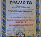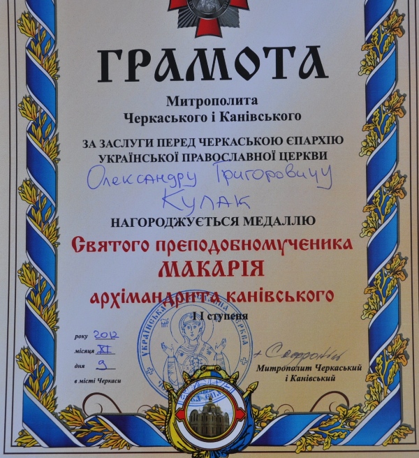 9 листопада 2012 року після урочистої церемонії встановлення маківки та хреста, що ознаменувало закінчення будівництва храму, голова правління страхової компанії Кулак Олександр Григорович, за заслуги перед Черкаською єпархією Української православної церкви, був нагороджений почесною грамотою та медаллю Святого преподобномученика Макарія ІІ ступеня.