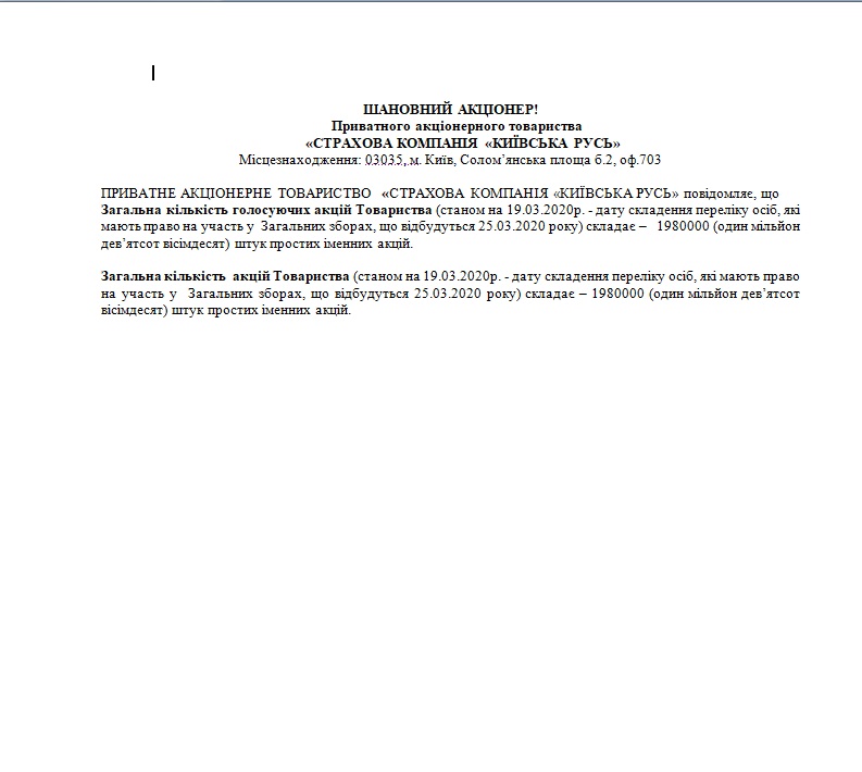 Загальна кількість голосуючих акцій Товариства (станом на 19.03.2020р. - дату складення переліку осіб, які мають право на участь у Загальних зборах, що відбудуться 25.03.2020 року) складає – 1 980 000 (один мільйон дев’ятсот вісімдесят тисяч) штук простих іменних акцій.