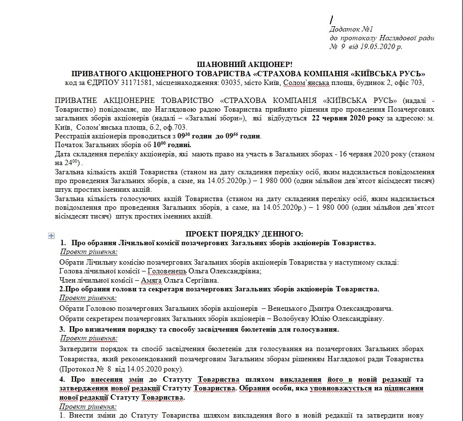ПРИВАТНЕ АКЦІОНЕРНЕ ТОВАРИСТВО «СТРАХОВА КОМПАНІЯ «КИЇВСЬКА РУСЬ» (надалі - Товариство) повідомляє, що Наглядовою радою Товариства прийнято рішення про проведення Позачергових загальних зборів акціонерів (надалі – «Загальні збори»),  які  відбудуться  22 червня 2020 року за адресою: м. Київ,  Солом’янська площа, б.2, оф.703.
