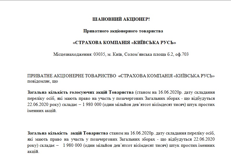 ШАНОВНИЙ АКЦІОНЕР! Приватного акціонерного товариства «СТРАХОВА КОМПАНІЯ «КИЇВСЬКА РУСЬ» Місцезнаходження: 03035, м. Київ, Солом’янська площа б.2, оф.703   ПРИВАТНЕ АКЦІОНЕРНЕ ТОВАРИСТВО «СТРАХОВА КОМПАНІЯ «КИЇВСЬКА РУСЬ» повідомляє, що Загальна кількість голосуючих акцій Товариства (станом на 16.06.2020р. дату складання переліку осіб, які мають право на участь у позачергових Загальних зборах - що відбудуться 22.06.2020 року) складає – 1 980 000 (один мільйон дев’ятсот вісімдесят тисяч) штук простих іменних акцій.   Загальна кількість акцій Товариства станом на 16.06.2020р. дату складання переліку осіб, які мають право на участь у позачергових Загальних зборах - що відбудуться 22.06.2020 року) складає – 1 980 000 (один мільйон дев’ятсот вісімдесят тисяч) штук простих іменних акцій.